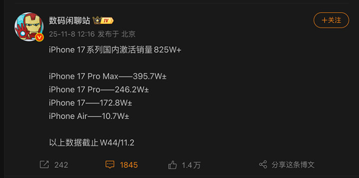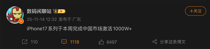 不过,Pro系列氧化褪色的情况仍然是个例,毕竟iPhone 17系列今年可以说是大获成功。按照11月2日的数据,iPhone 17系列仅在中国就已经实现了825万部的激活量,其中Pro和Pro Max贡献了多达75%的份额。而到本周,17系列总激活量已经超过1000万部。